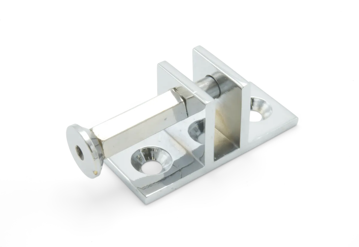 A small end/vent bracket with a plunger style mounting pin finished in chrome. This bracket is part of the telescopic screwjack small bracket set.